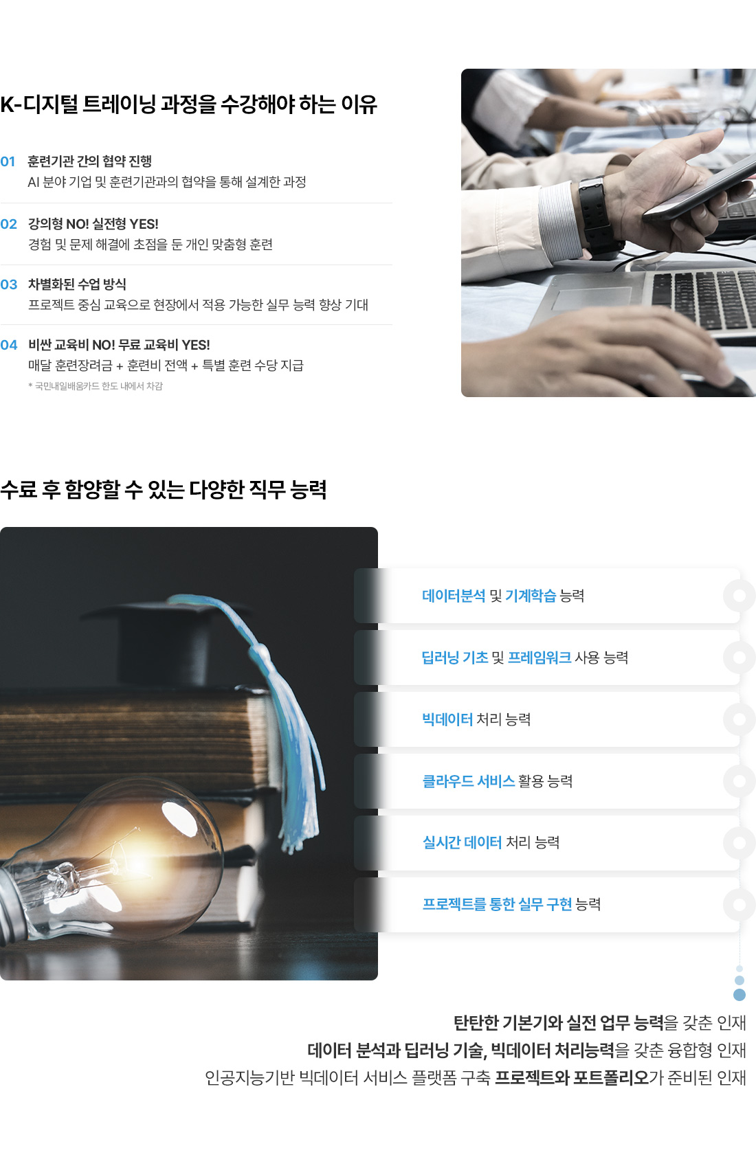 4차 산업혁명에 요구되는 디지털 핵심 실무 인재를 양성하기 위한 한국판 뉴딜 정책으로 새로운 IT 시대를 위한 신기술 훈련과정입니다.